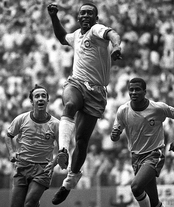 Pelé foi o primeiro jogador midiático do futebol, com tudo aquilo de bom e de ruim que isso poderia trazer (acima, Pelé dando a famosa "bicicleta" em um jogo da Seleção Brasileira em 1965). A sua trajetória como esportista acompanhou a própria evolução da televisão como meio de comunicação de massas. Participou da primeira Copa de Futebol transmitida ao vivo para o mundo, via satélite, em 1970 no México, da qual saiu consagrado como o "Rei do Futebol". Antes disso, já havia estado, com apenas 17 anos de idade, na conquista da então inédita Copa do Mundo para o Brasil em 1958 na Suécia e participou de outra conquista em 1962 no Chile (embora saísse machucado no segundo jogo). Com Pelé passamos a ser conhecidos como "o país do futebol" e também a partir dele o Brasil começou a parar as suas atividades cotidianas para acompanhar as partidas da Seleção nos jogos da Copa.